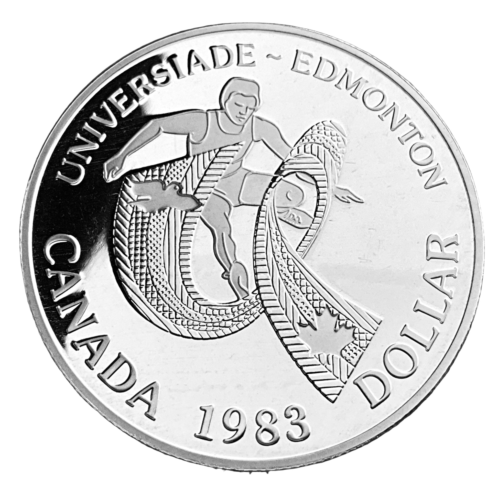 The inscription "UNIVERSIADE ~ EDMONTON" and "CANADA 1983 DOLLAR" are clearly visible on the coin.