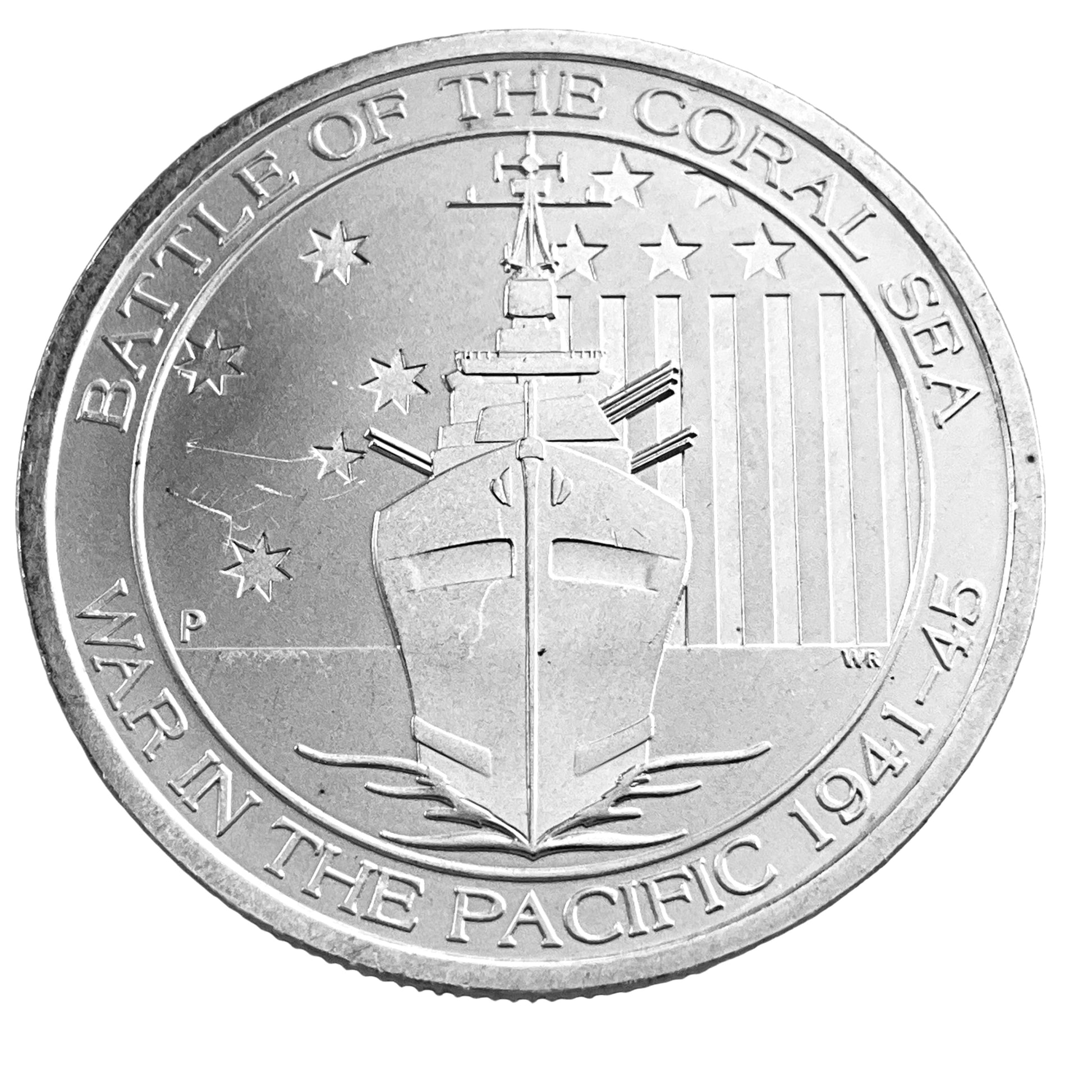 Inscriptions: The coin is inscribed with "WAR IN THE PACIFIC 1941-45" and "BATTLE OF THE CORAL SEA".