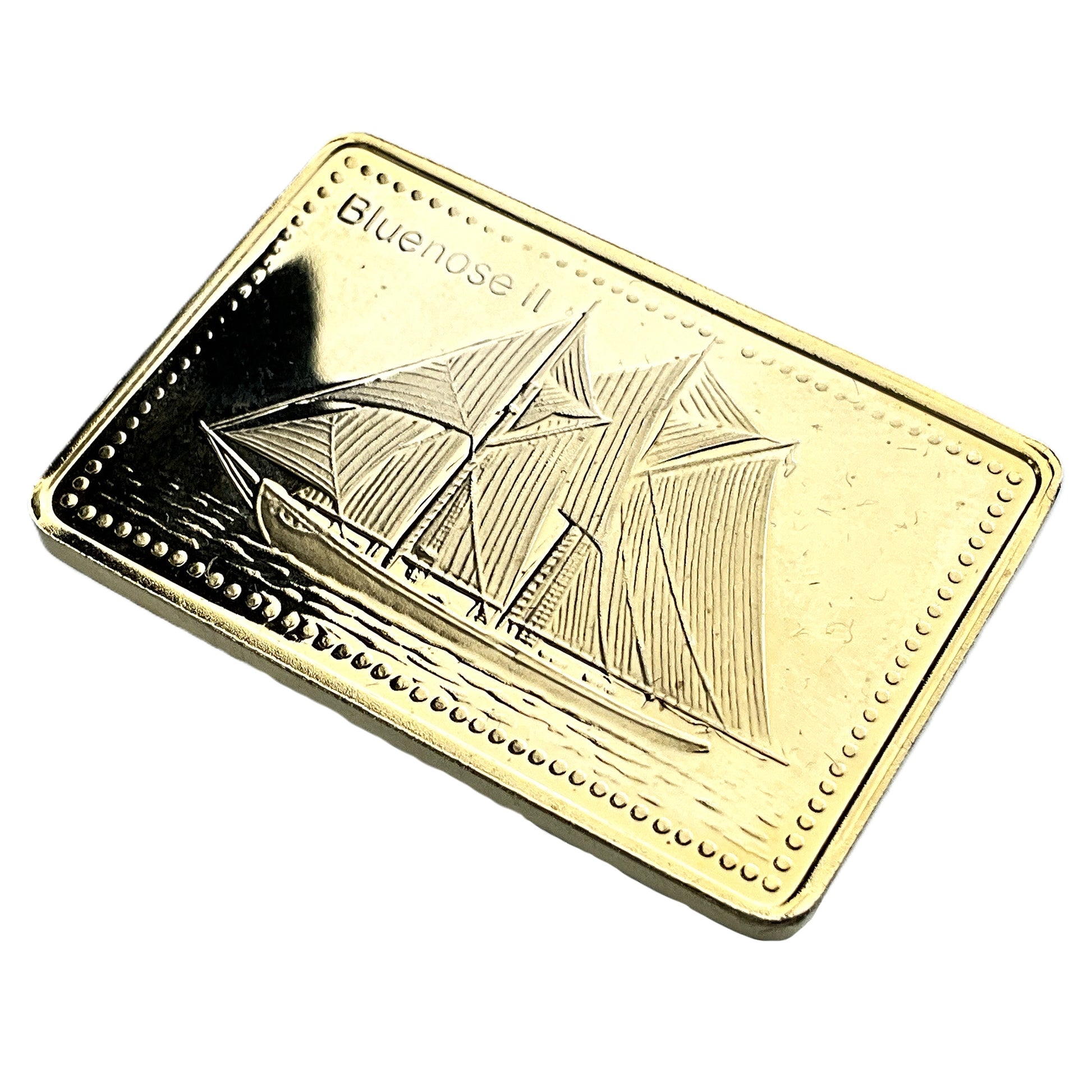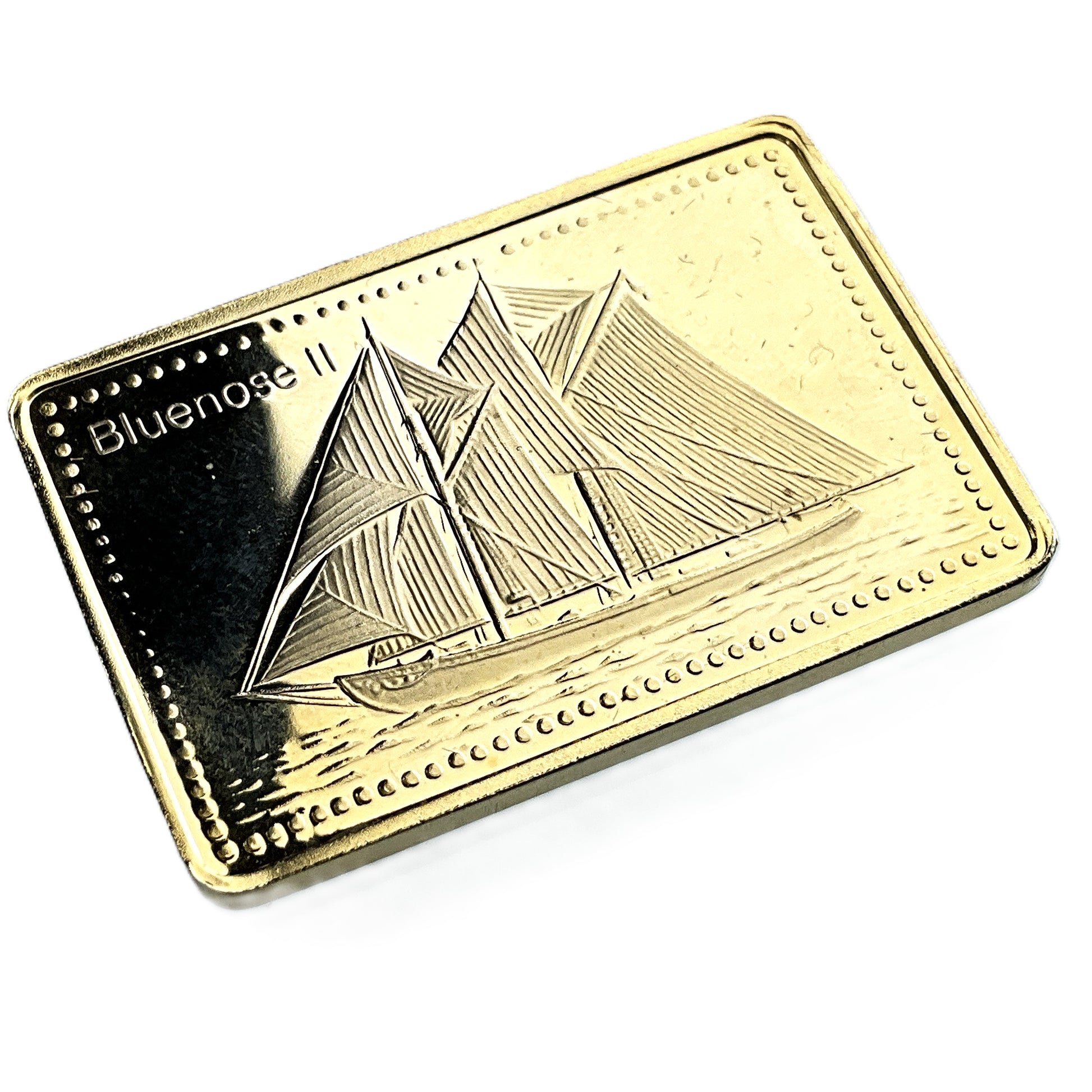 The image displays a small, gold-colored 999 silver bar shaped like the schooner Bluenose II, accompanied by a descriptive card. The card provides details about the ship's history and specifications.