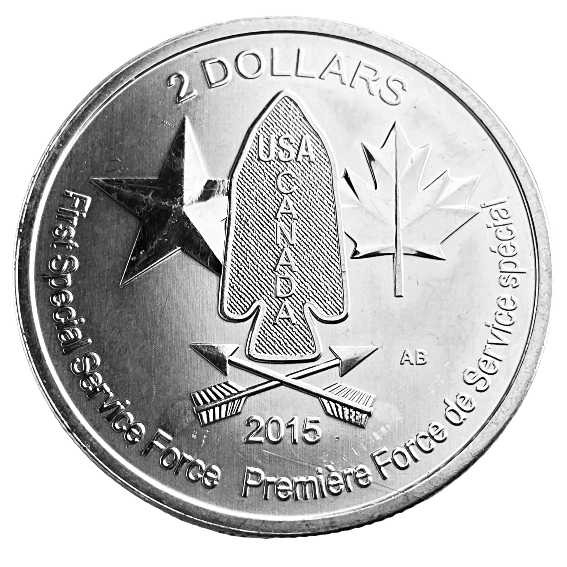This image displays the reverse side of the 2015 Canadian Two-Dollar ($2) fine silver coin commemorating the First Special Service Force.