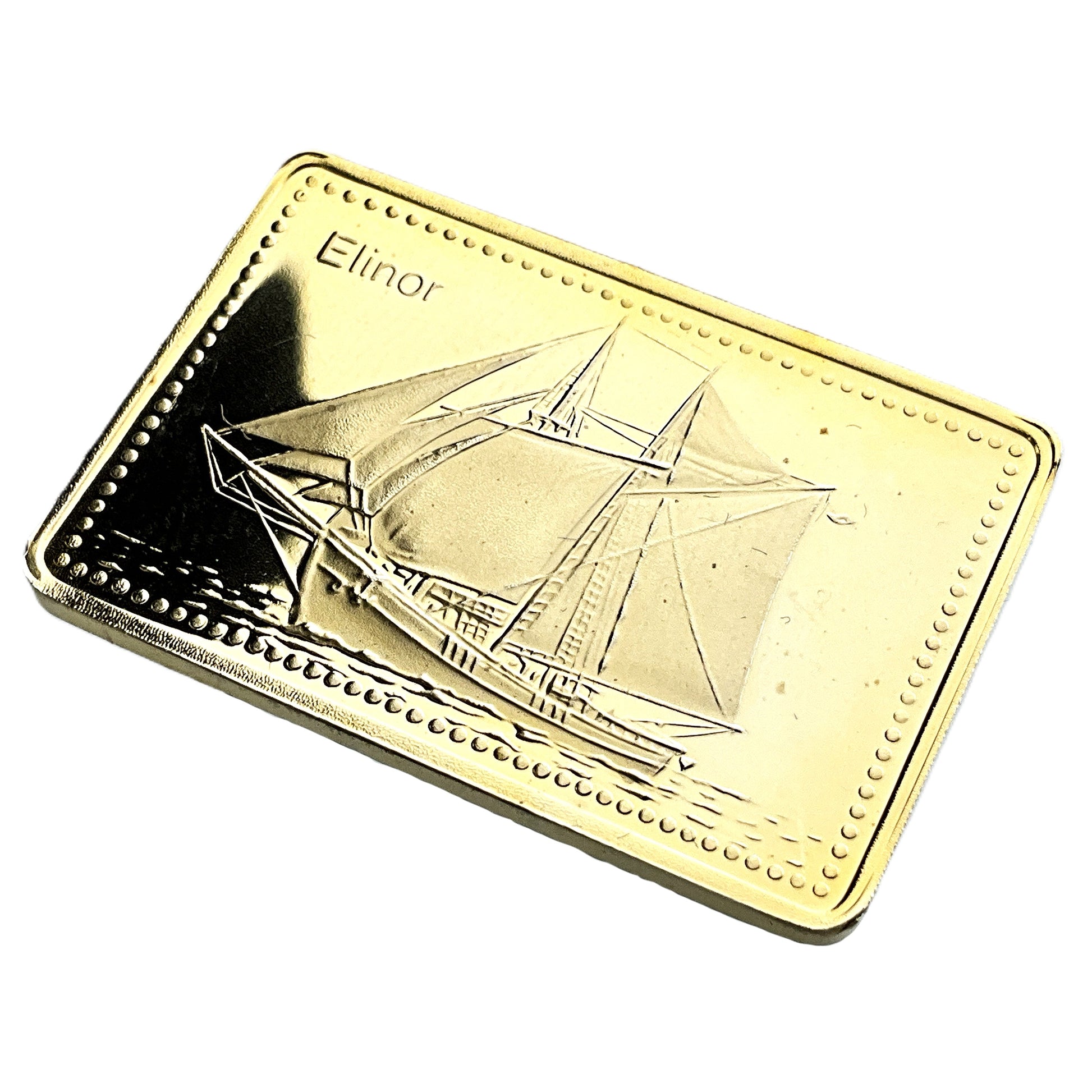 The image displays a gold-colored collectible silver ingot featuring an etching of the tall ship Elinor, alongside a card providing a drawing and descriptive text about the vessel. The text describes the Elinor as a Danish two-masted schooner built in 1906 that serves as a training ship.