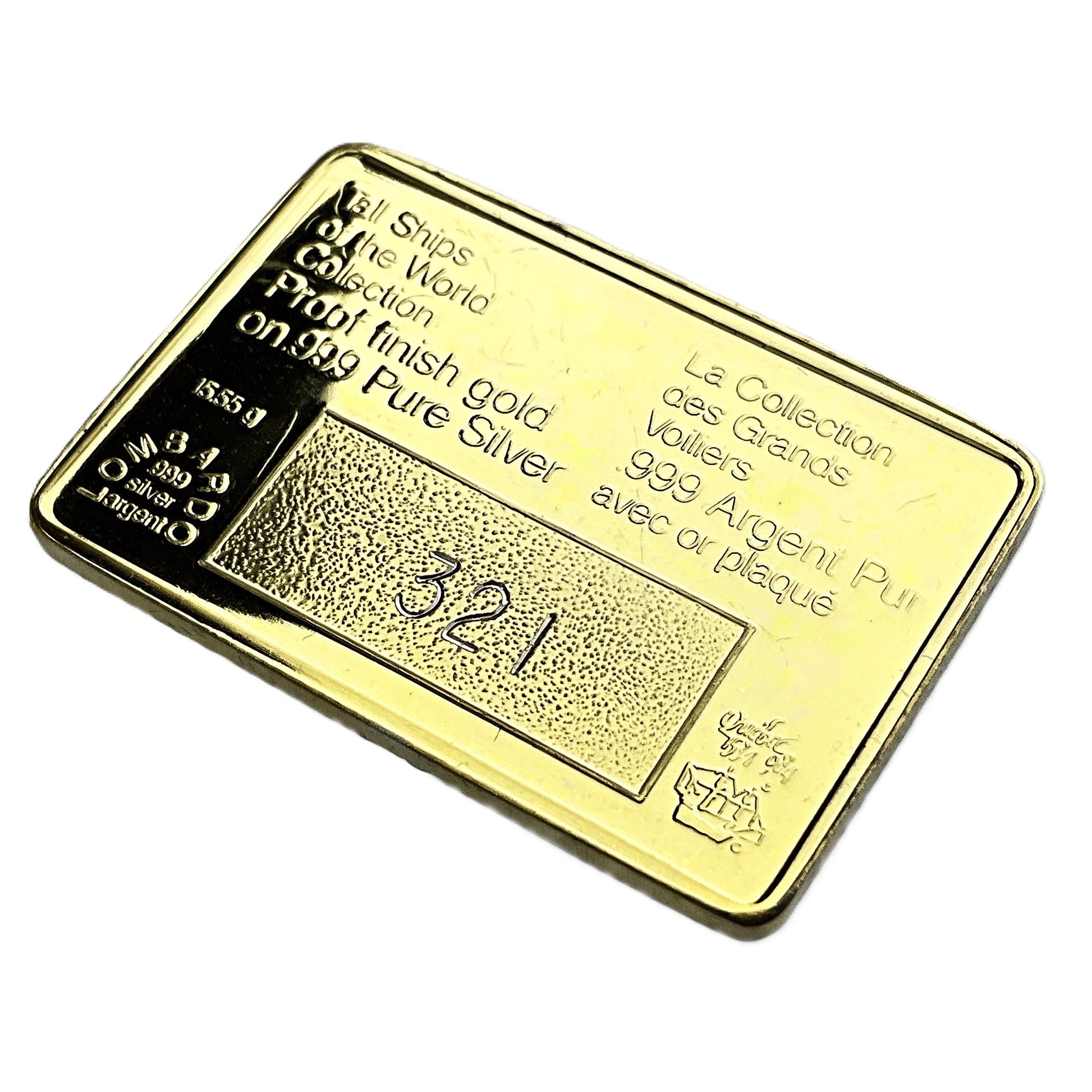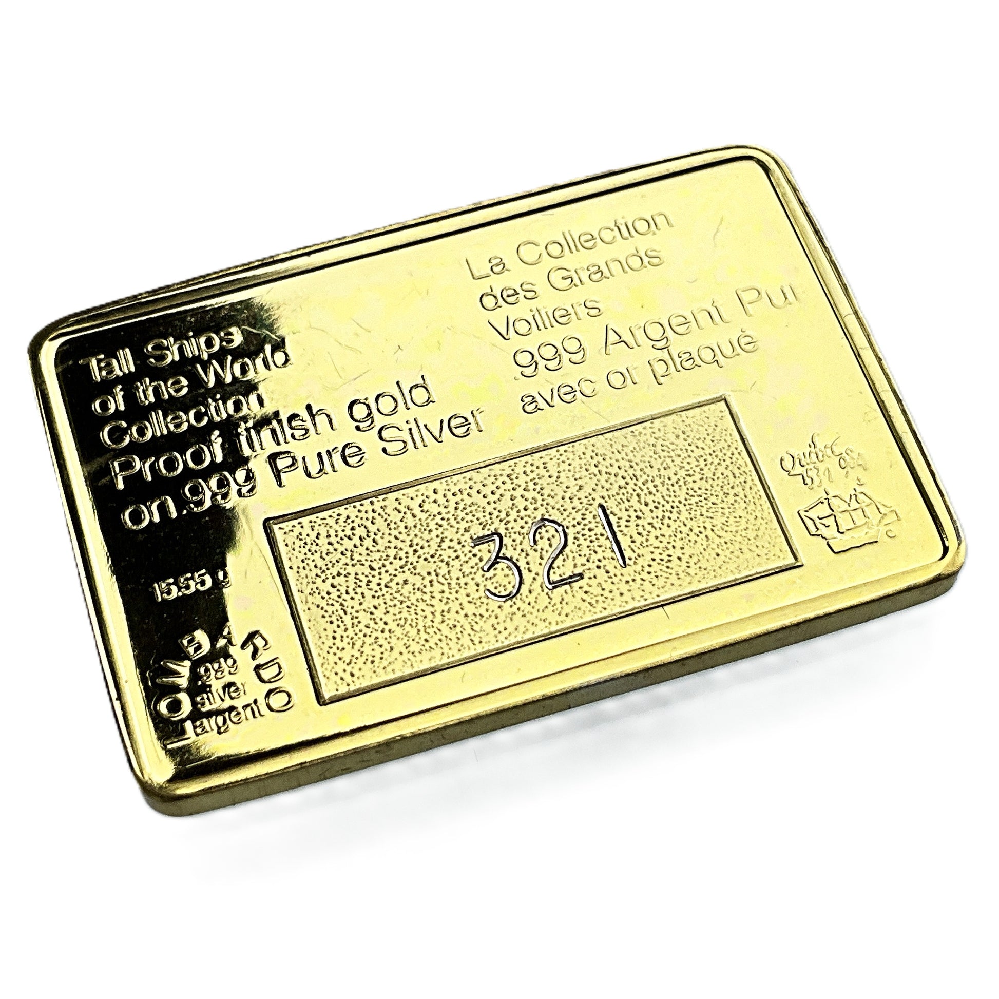 The image displays a gold-colored 999 silver bar and a descriptive card for a two-masted schooner named the Island Queen. The card details the ship's history and vital statistics.