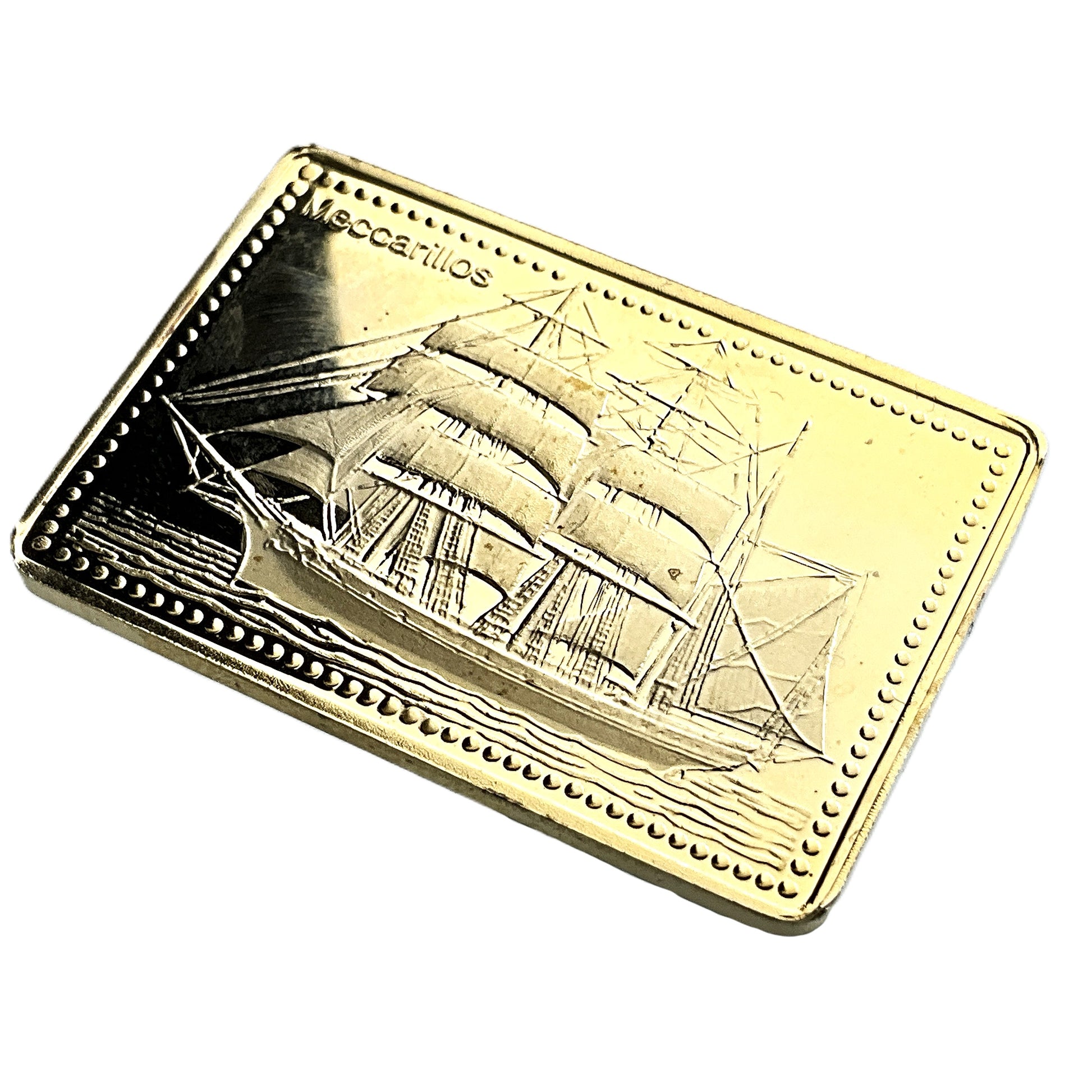 The image displays a silver bar featuring an image of the tall ship Meccarillos, accompanied by a descriptive card.