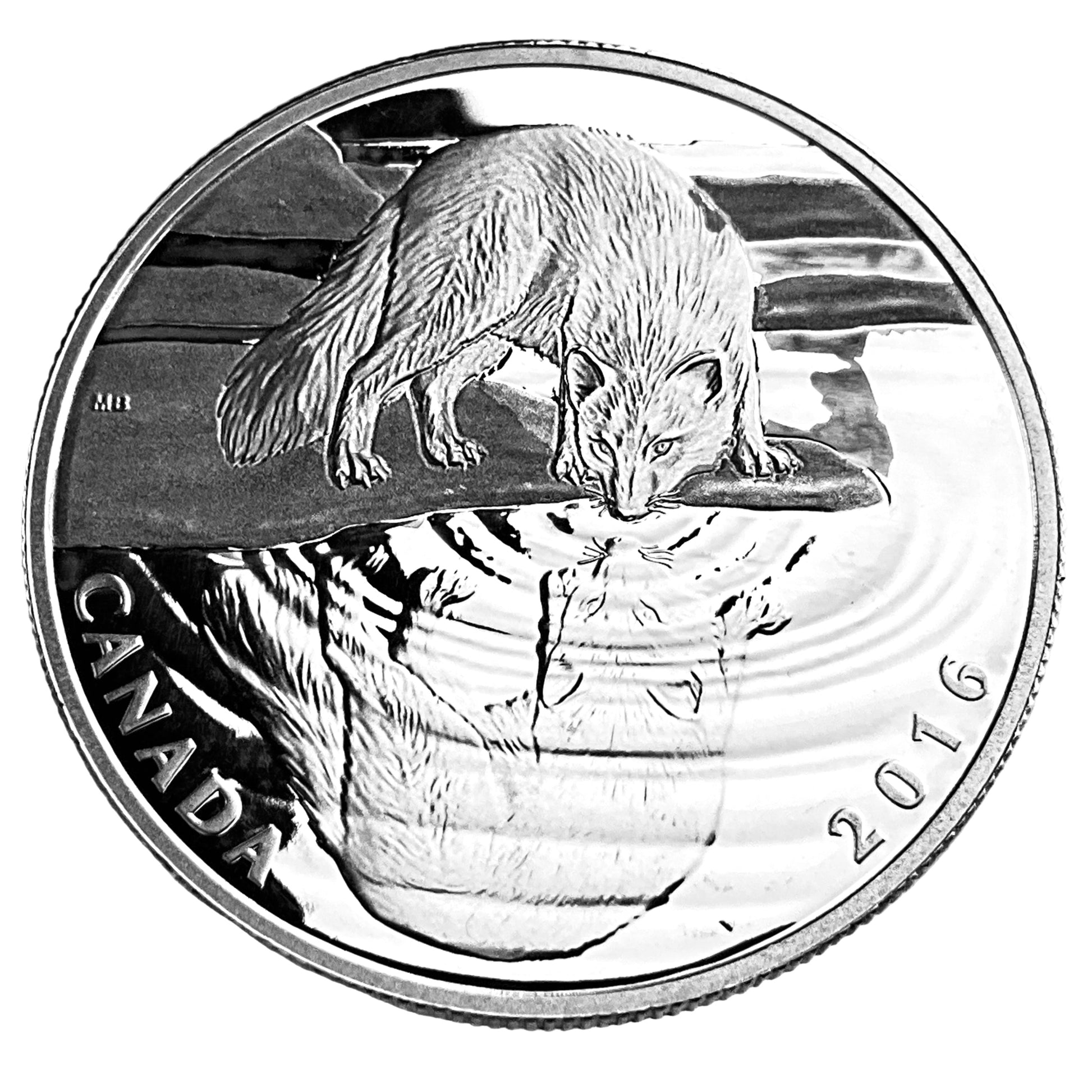 The coin features an Arctic Fox at the water's edge, with its reflection visible in the rippling water. The design was created by Canadian artist Maurade Baynton.