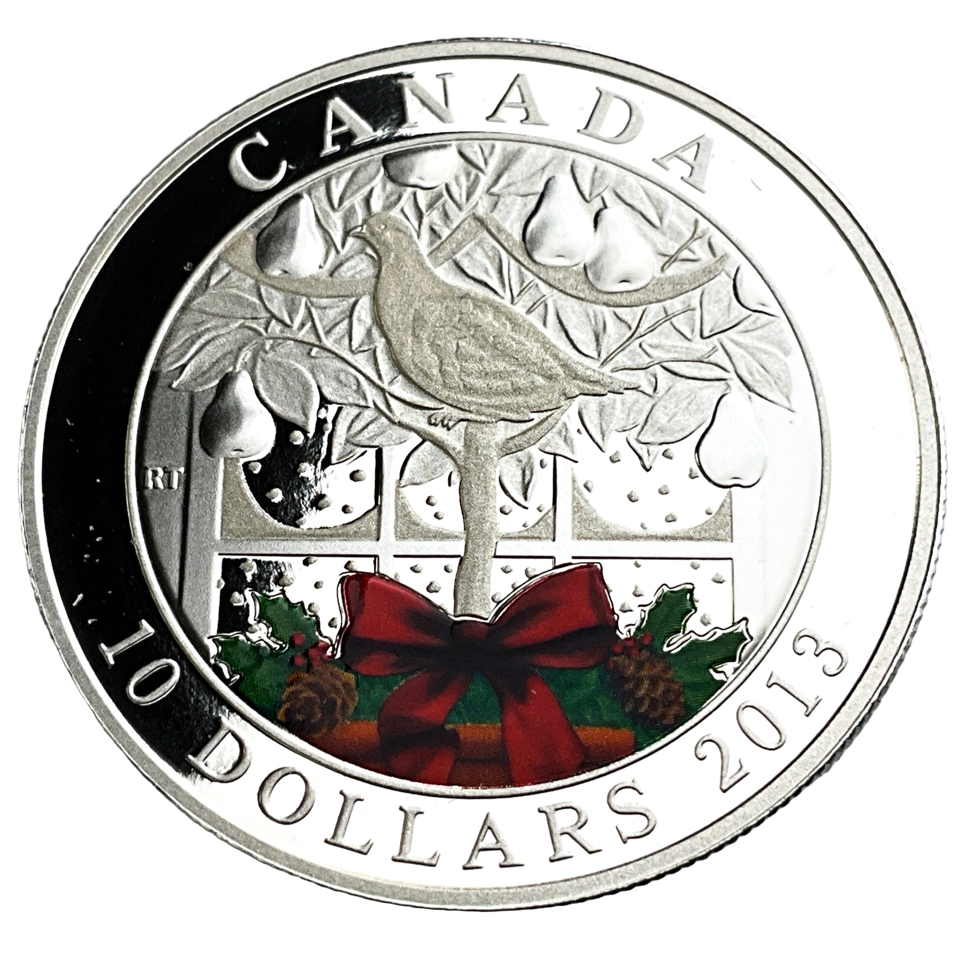 This is the 2013 Royal Canadian Mint $10 Fine Silver Coin featuring "A Partridge in a Pear Tree".
