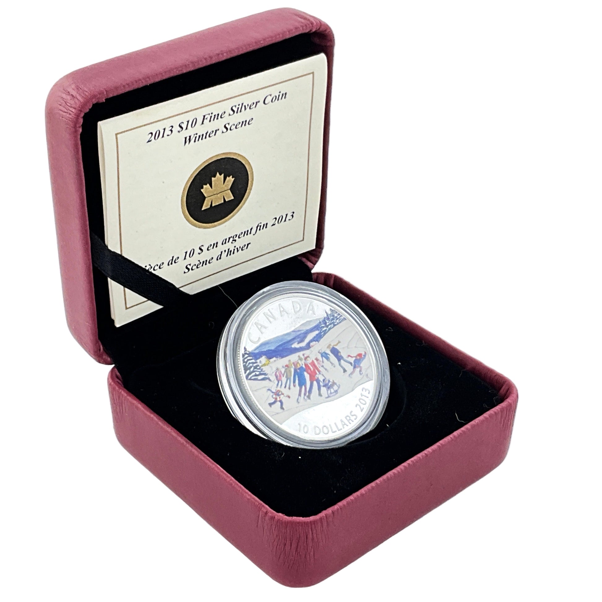 The image shows the reverse side of the 2013 Royal Canadian Mint $10 Fine Silver Coin, known as the "Winter Scene" coin.