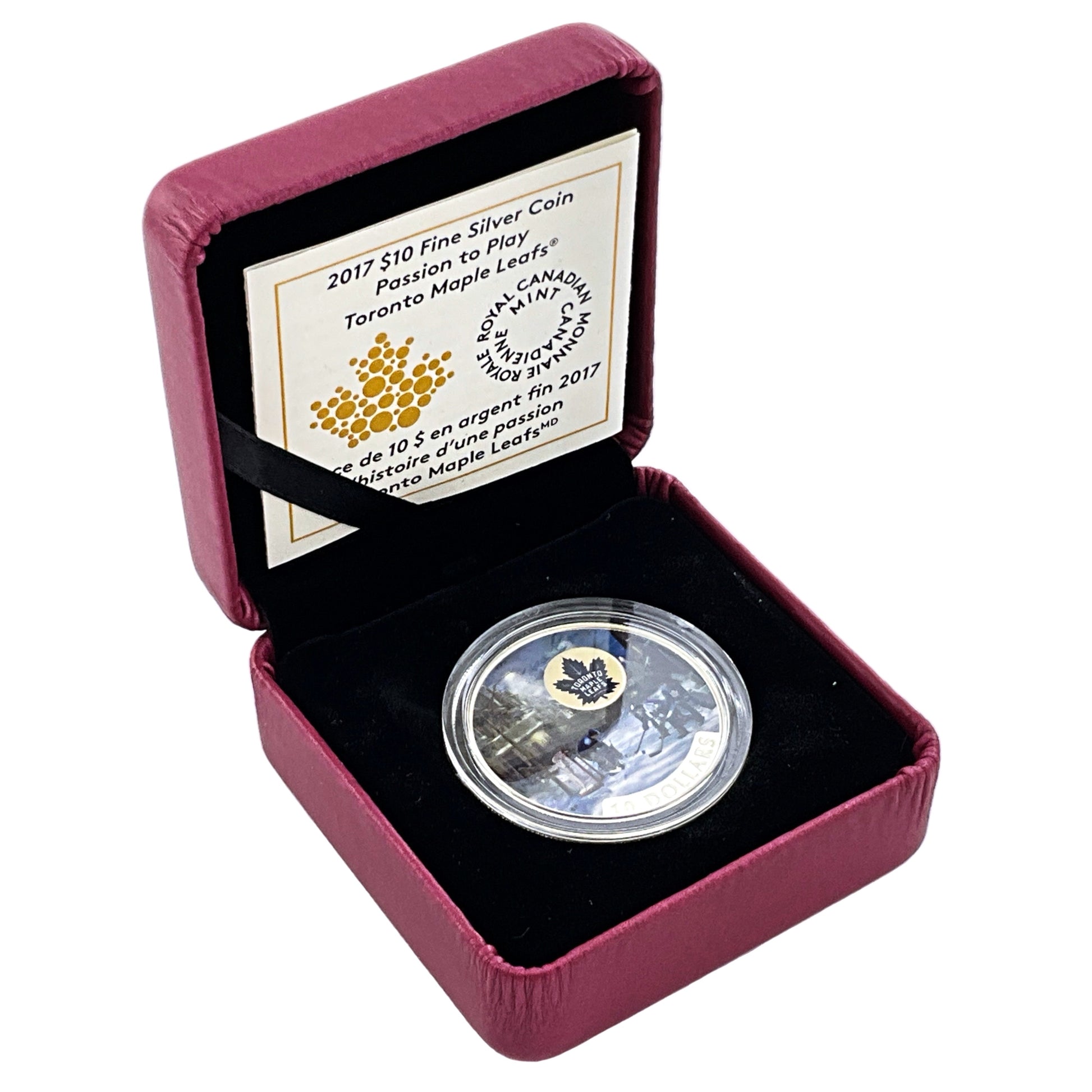This is the 2017 $10 Passion to Play: Toronto Maple Leafs pure silver coin, issued by the Royal Canadian Mint.