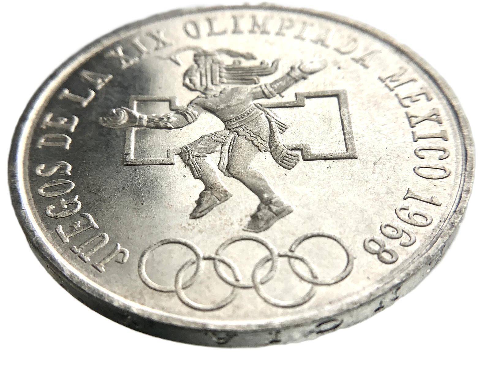 This is a 1968 Mexico Silver 25 Pesos Olympic coin.