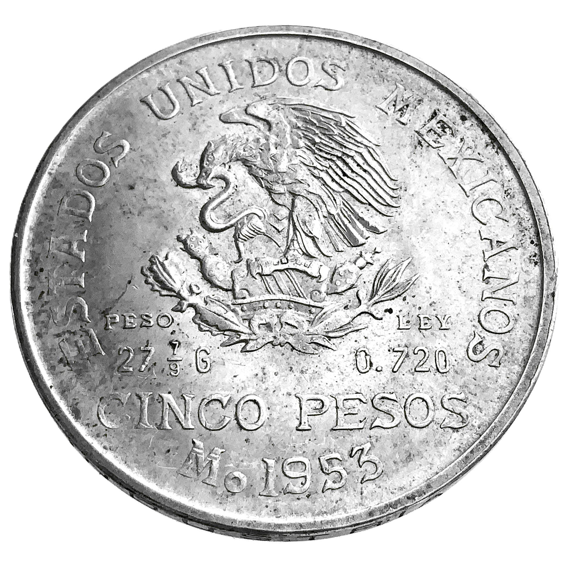This is a 1953 Mexican Silver 5 Pesos coin, also known as the "Hidalgo" or "Cinco Pesos" coin. It was minted to commemorate the bicentennial of the birth of Miguel Hidalgo y Costilla, a hero of the Mexican War of Independence.