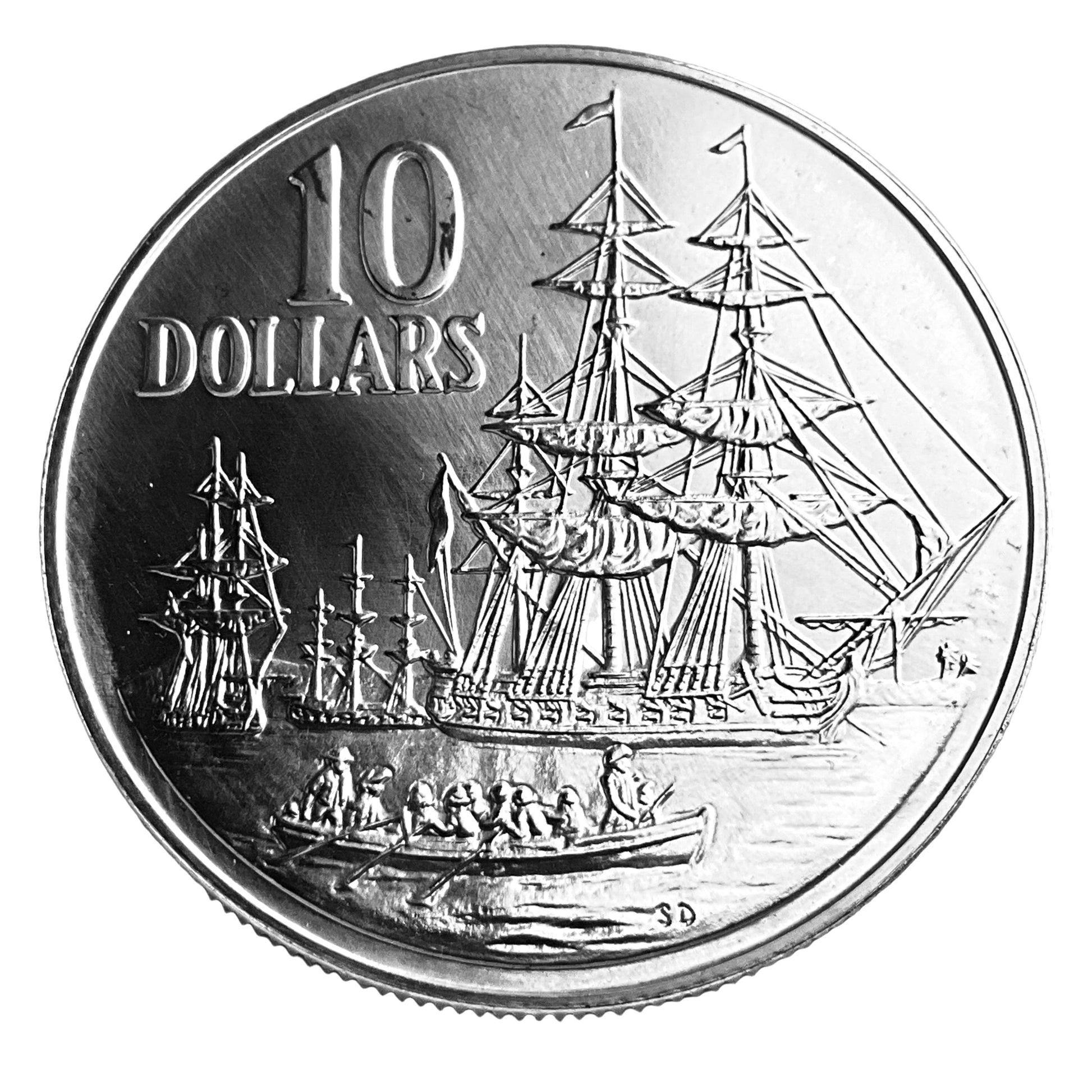 Design: The reverse features three ships of the First Fleet in the background and a rowboat with nine men in the foreground, designed by Stuart Devlin. The obverse features the third portrait of Queen Elizabeth II.