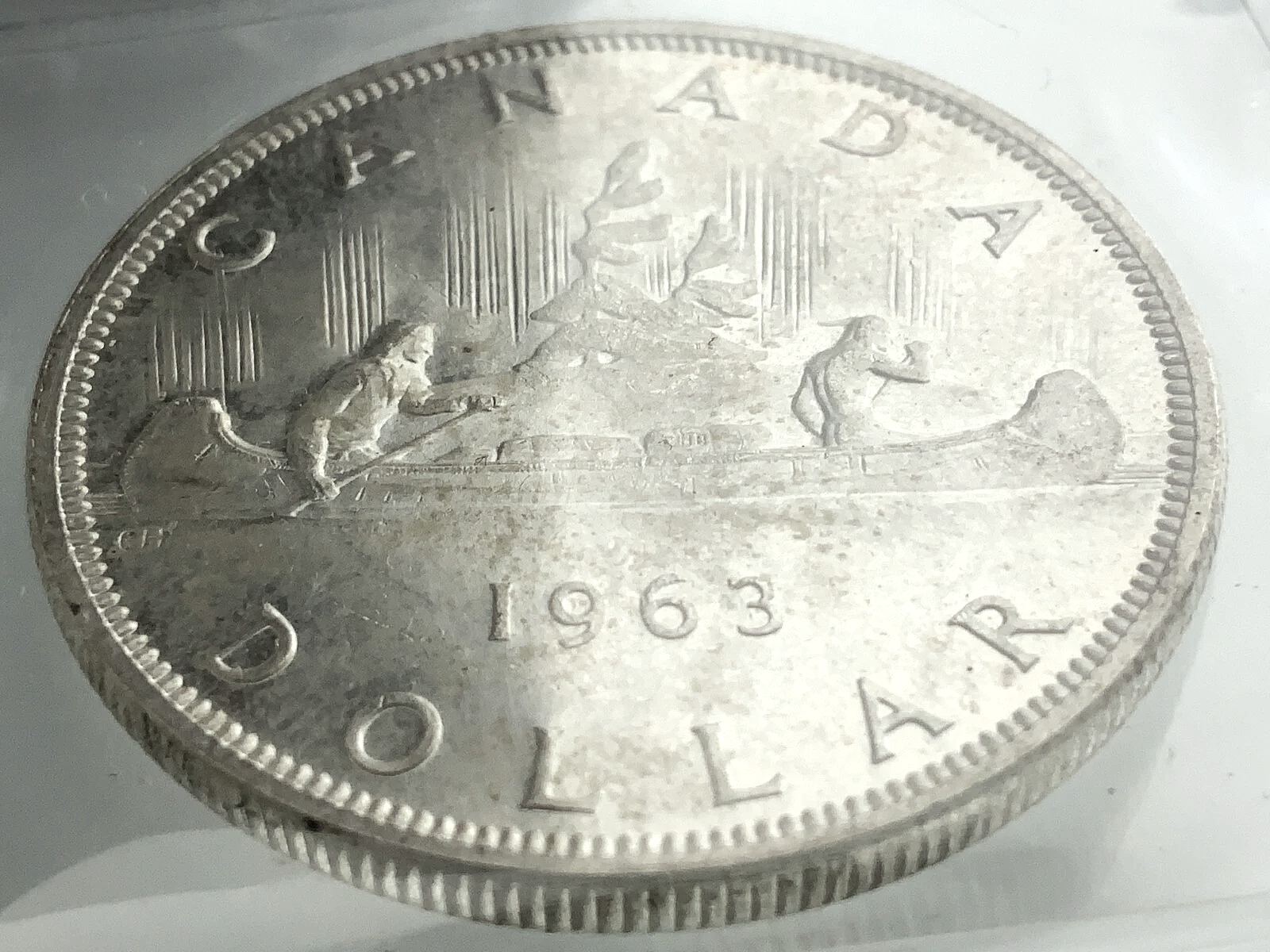 This is a 1963 Canadian silver dollar coin, also known as the "Voyageur" dollar.