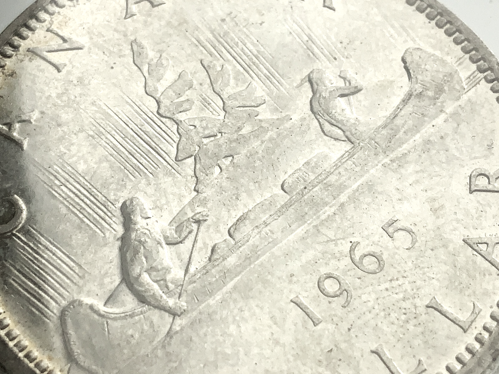 This is a 1965 Canadian small beads pointed 5 silver dollar coin featuring the "Voyageur" design. Key specifications and features include:
