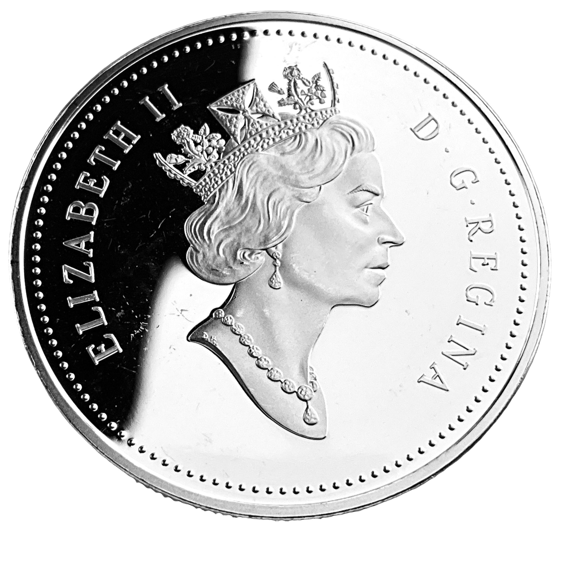 The image displays the obverse side of a Canadian Silver Dollar, featuring a portrait of Queen Elizabeth II. The inscription "ELIZABETH II" and "D. G. REGINA" (Dei Gratia Regina, meaning "By the Grace of God, Queen") are visible around the effigy. This design is typical of Canadian coinage featuring the reigning monarch.