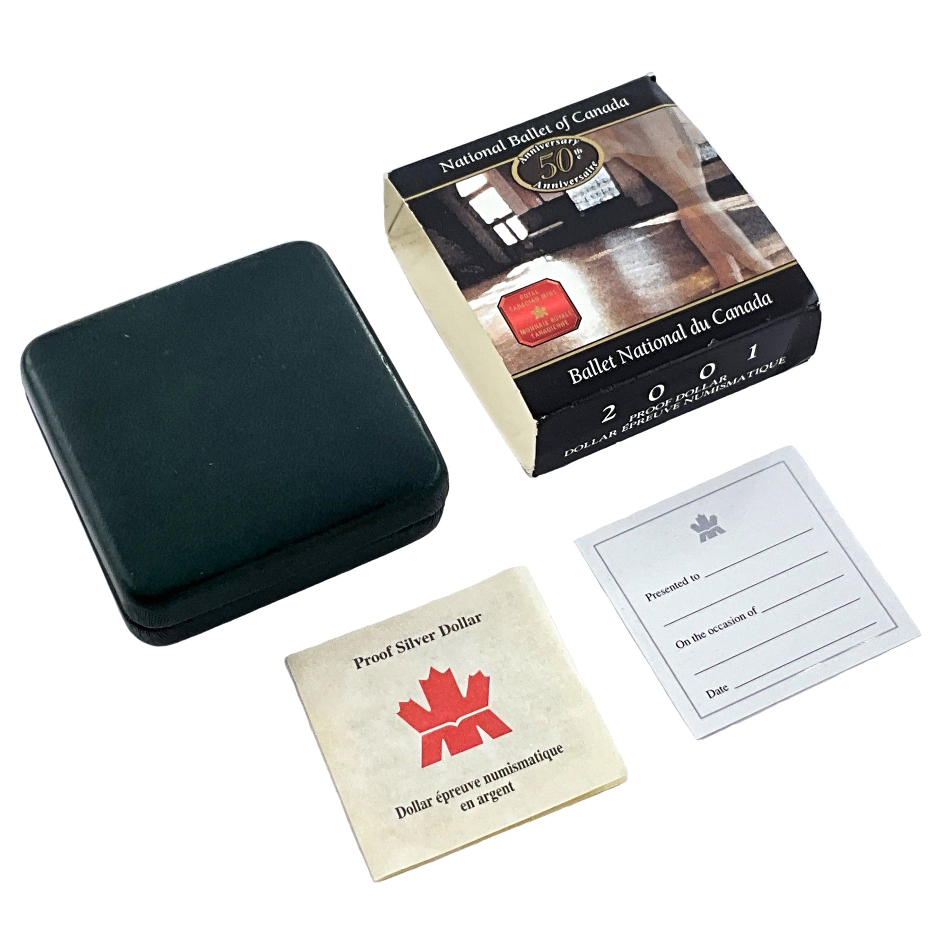 The image shows the 2001 Canadian Proof Silver Dollar commemorating the 50th anniversary of the National Ballet of Canada.