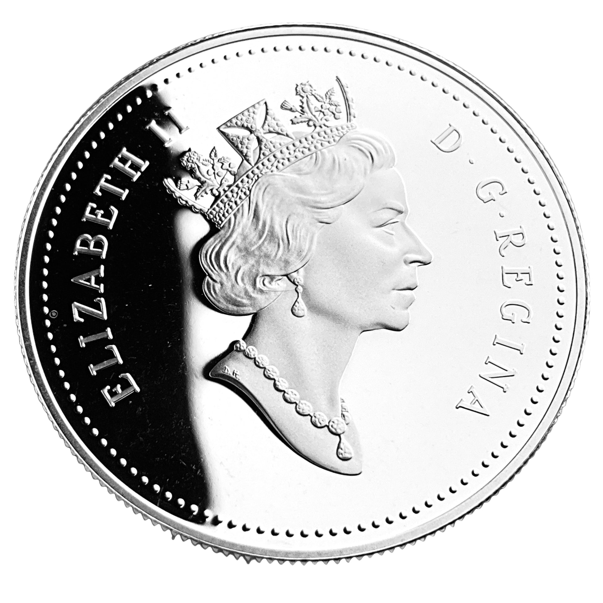 The image displays the obverse side of a Canadian Silver Dollar, featuring a portrait of Queen Elizabeth II. The inscription "ELIZABETH II" and "D. G. REGINA" (Dei Gratia Regina, meaning "By the Grace of God, Queen") are visible around the effigy. This design is typical of Canadian coinage featuring the reigning monarch.