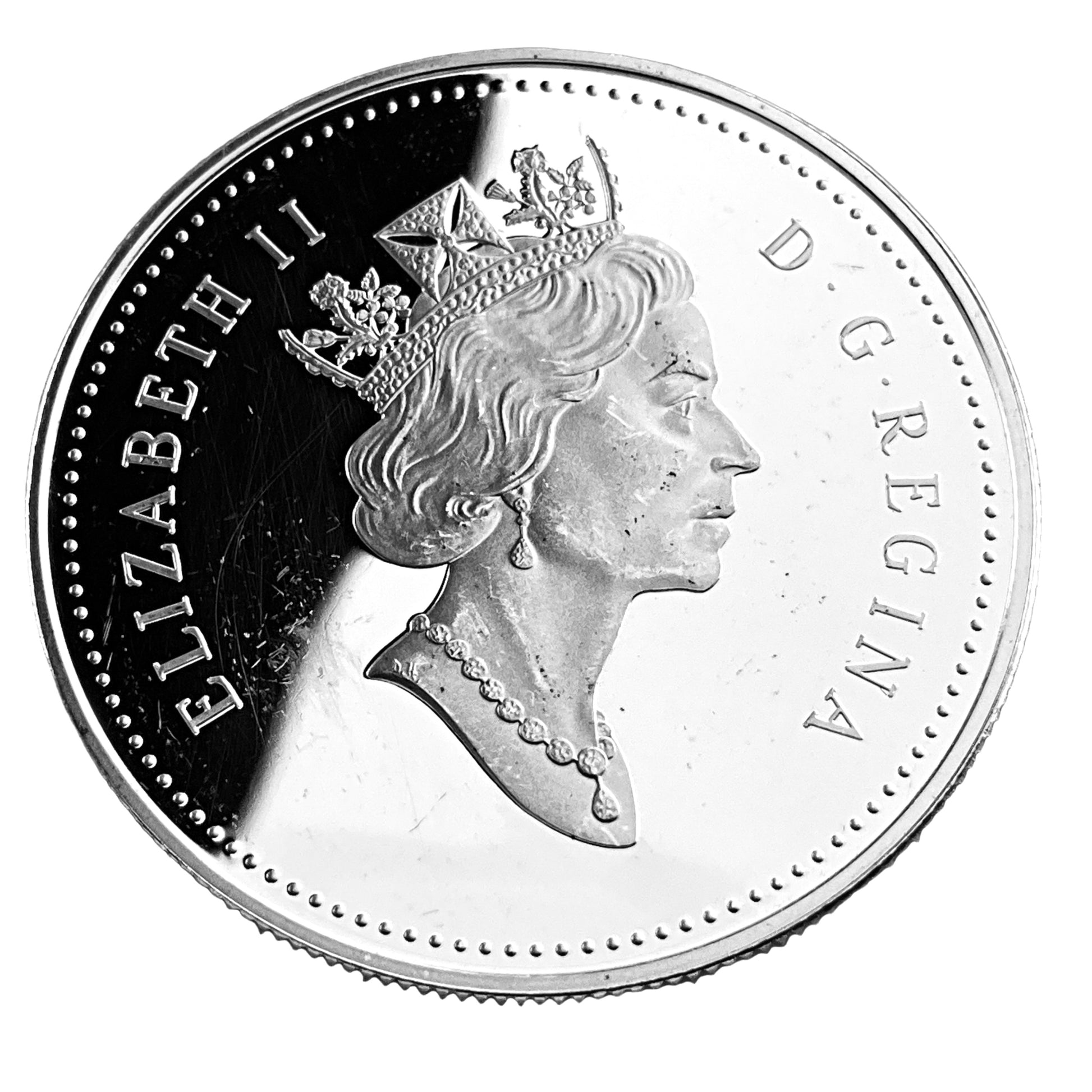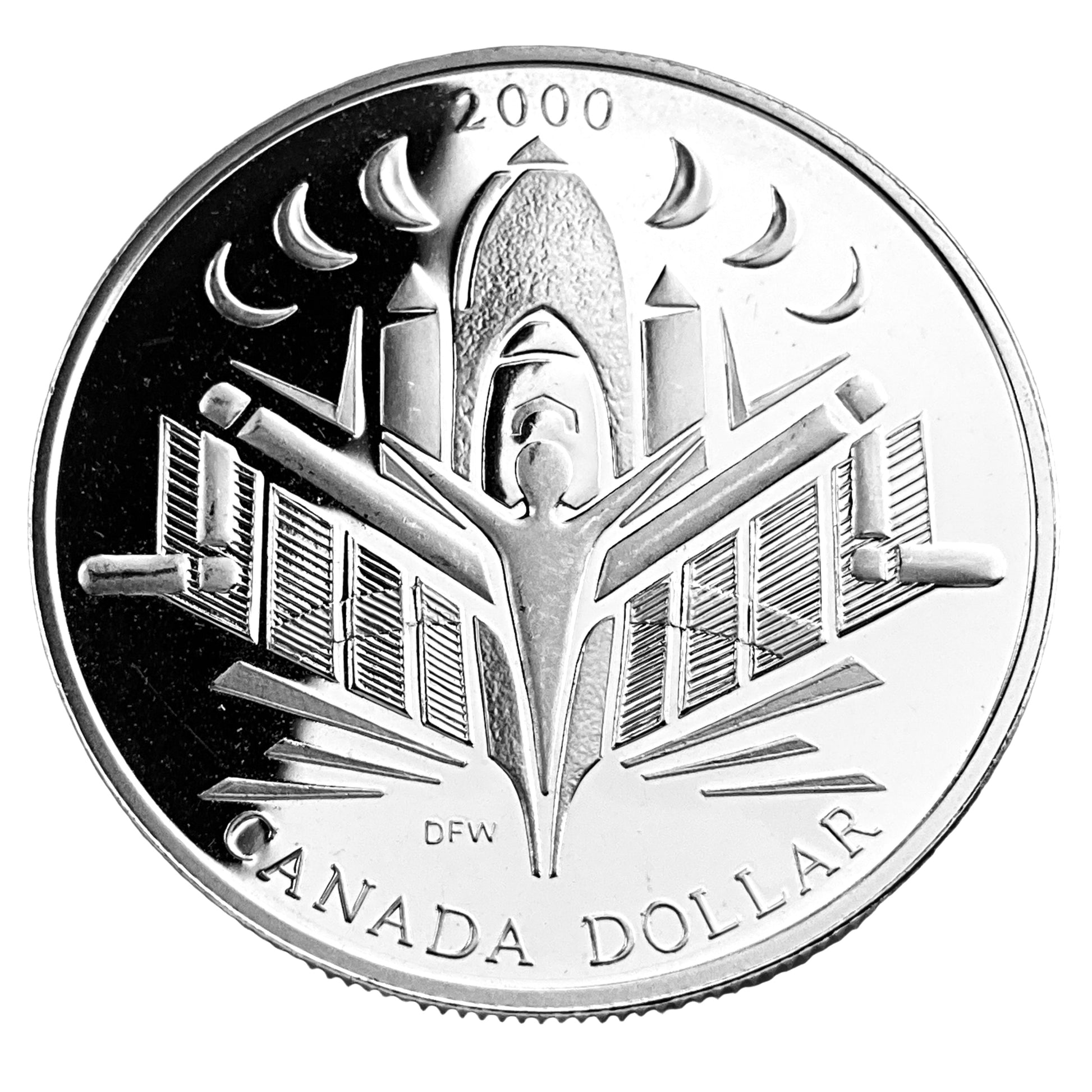 This commemorative coin features a design symbolizing Canada's space exploration and future aspirations at the turn of the millennium, with a spaceship poised for launch.