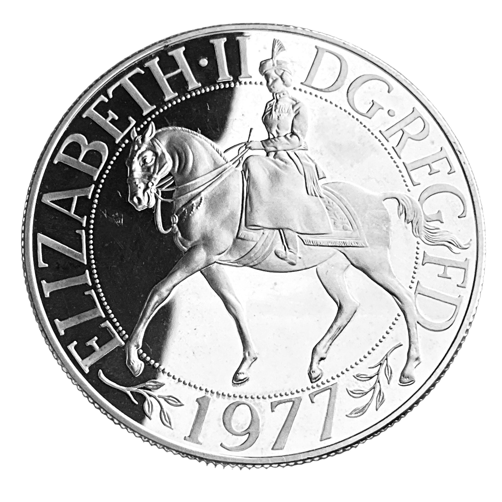 The image shows a 1977 Queen Elizabeth II Silver Jubilee Crown coin.