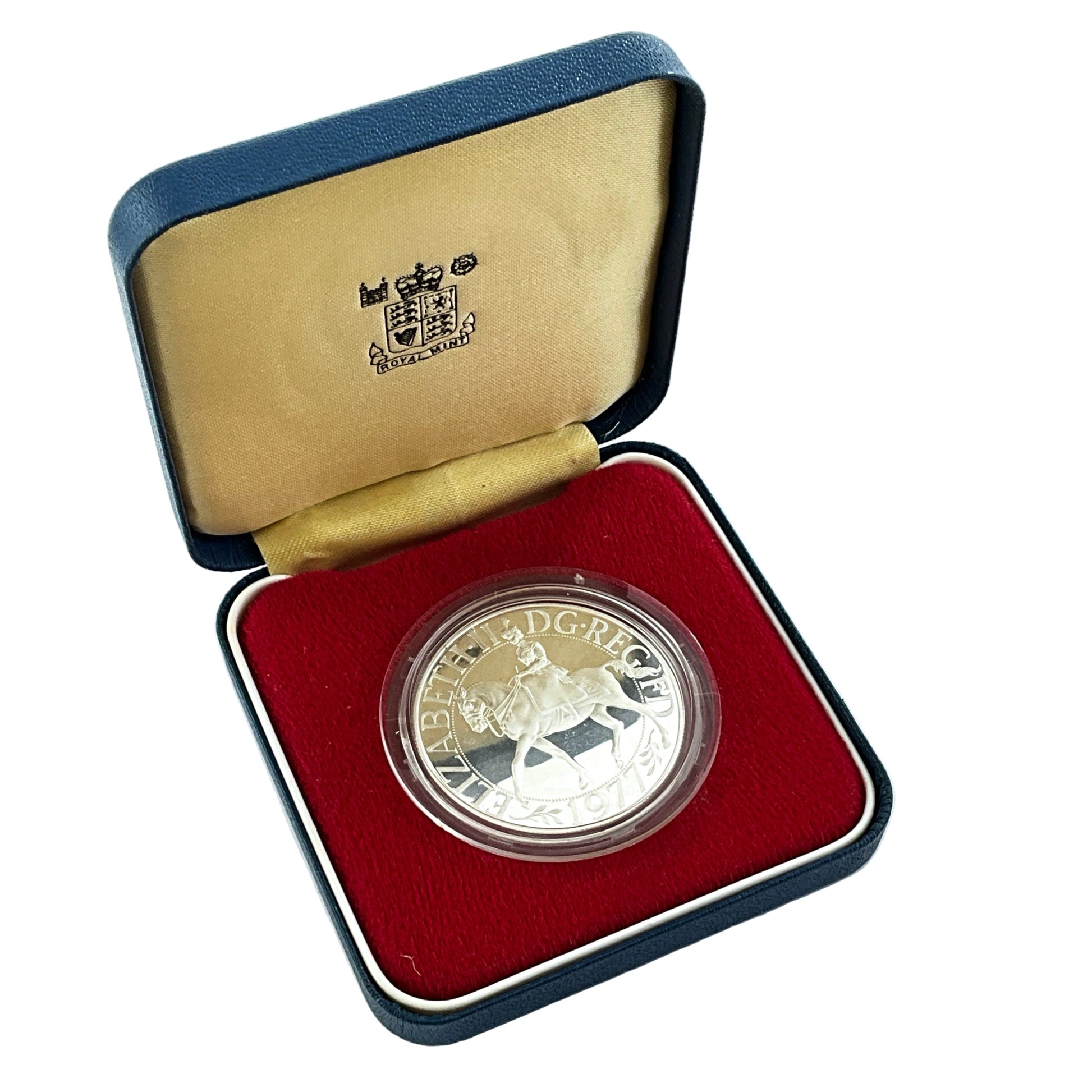 This coin was minted by the UK Royal Mint to commemorate the 25th anniversary of Queen Elizabeth II's accession to the throne in 1952.