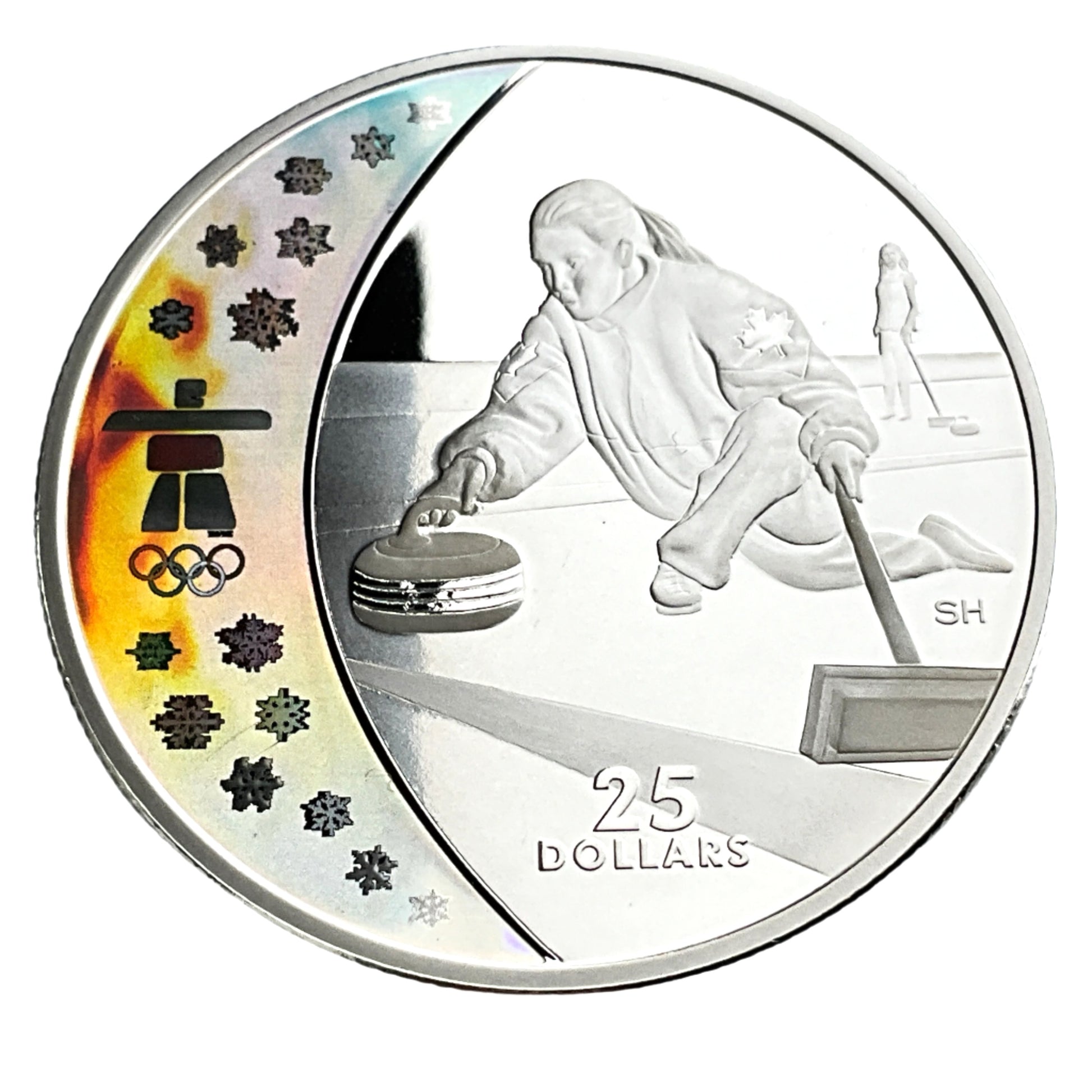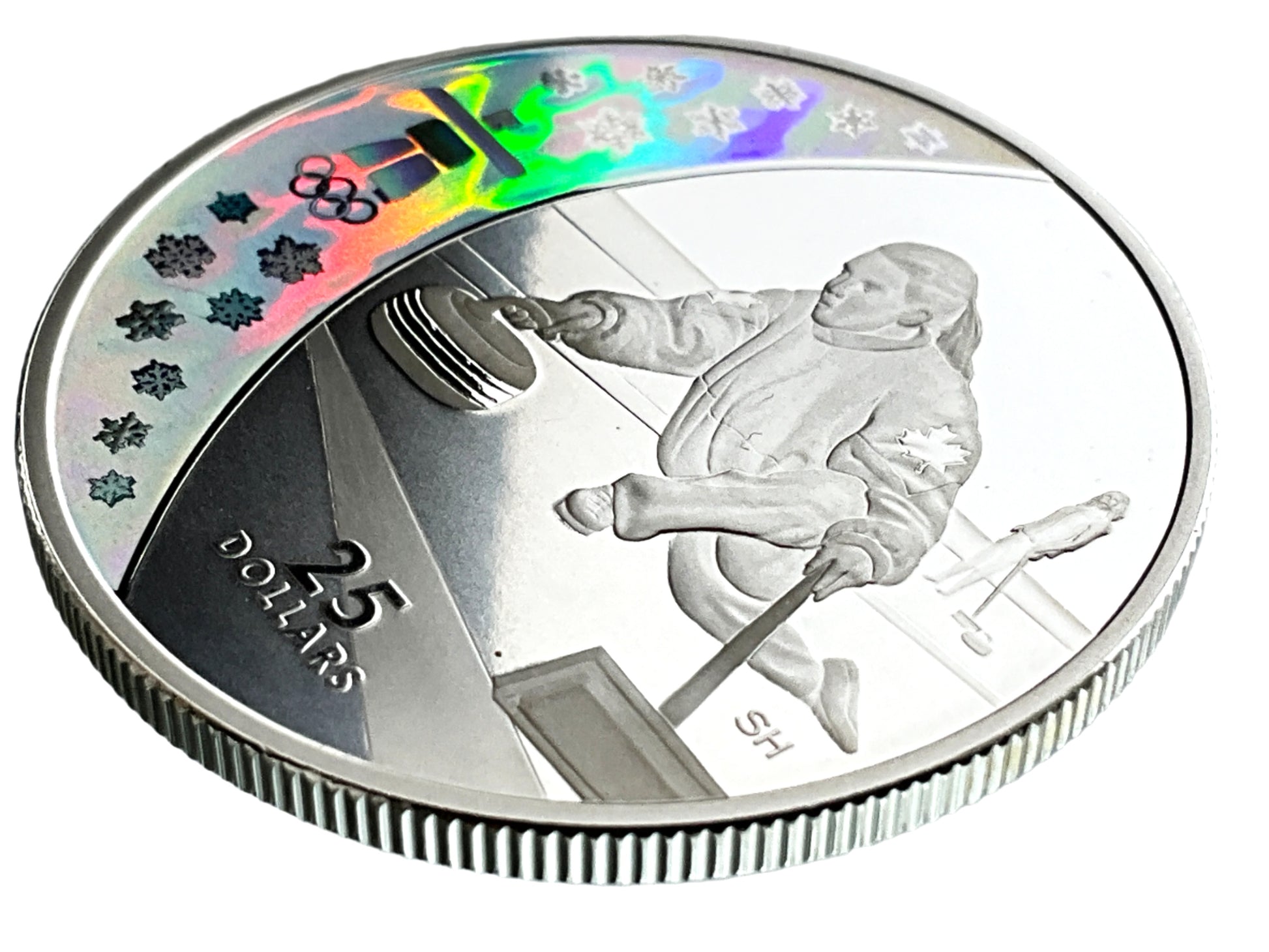 The coin showcases a curler in action, with a selective hologram highlighting the Vancouver 2010 Olympic Winter Games emblem.