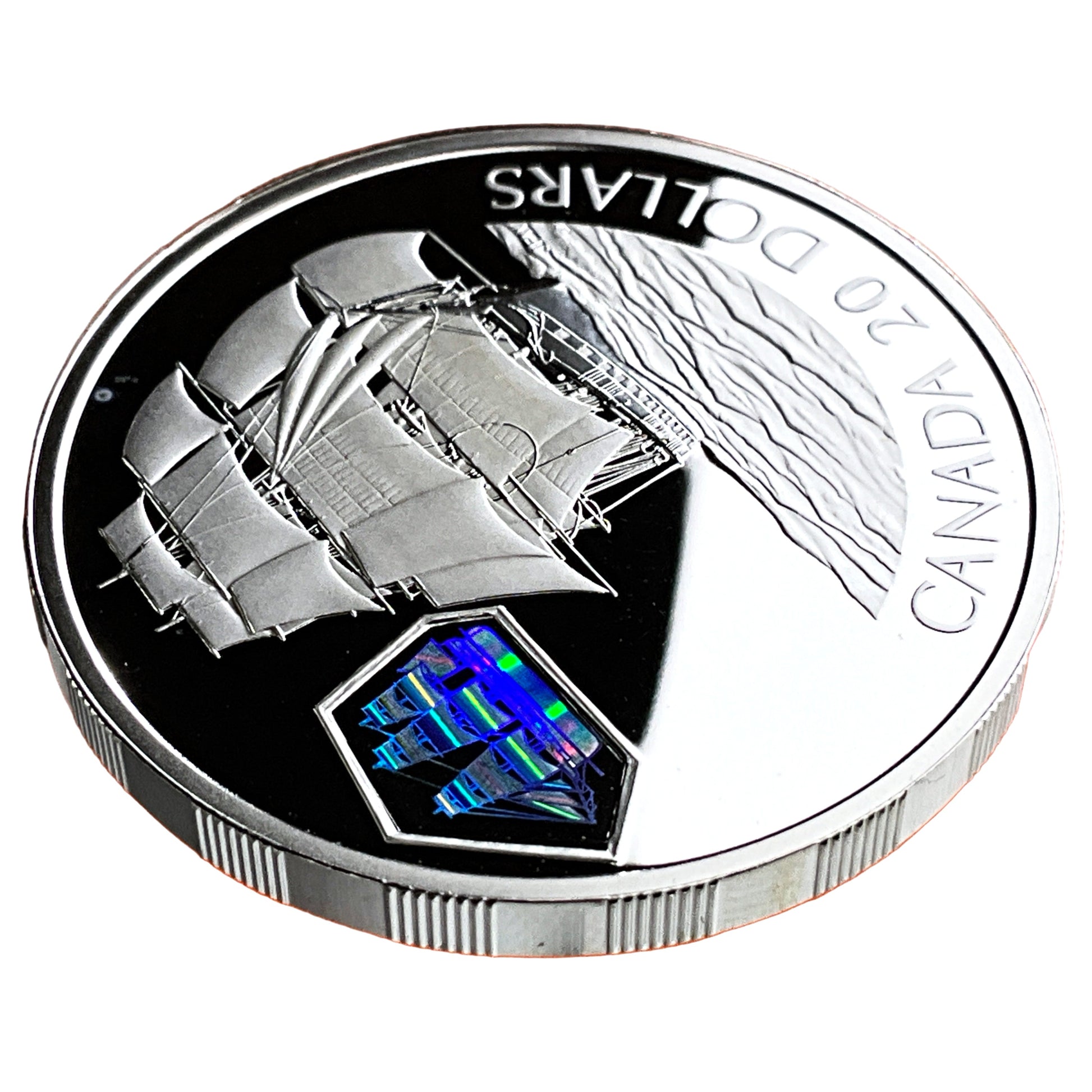 This image shows a Canadian $20 silver coin featuring a sailing ship and an iridescent insert.