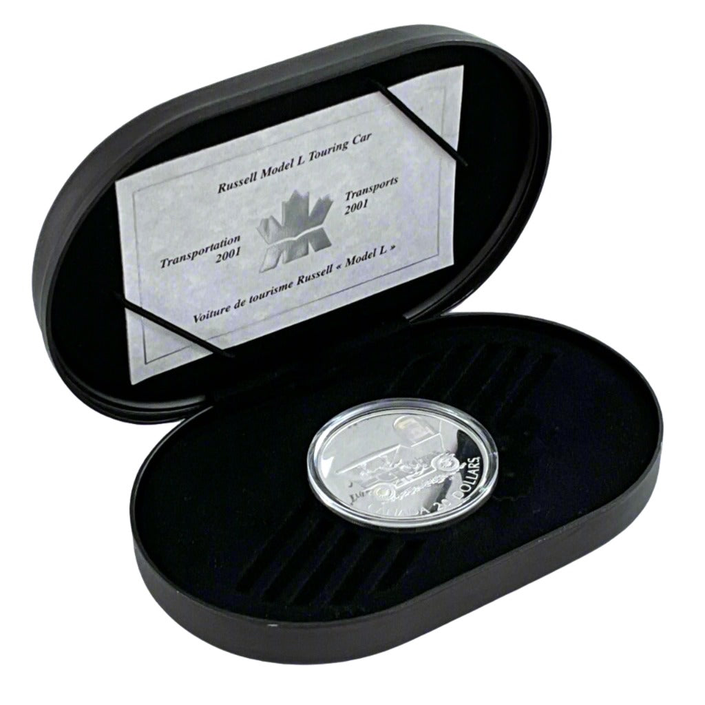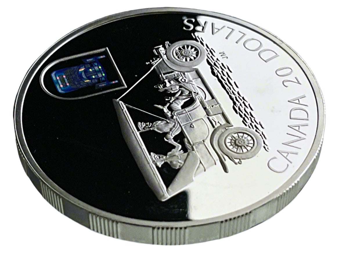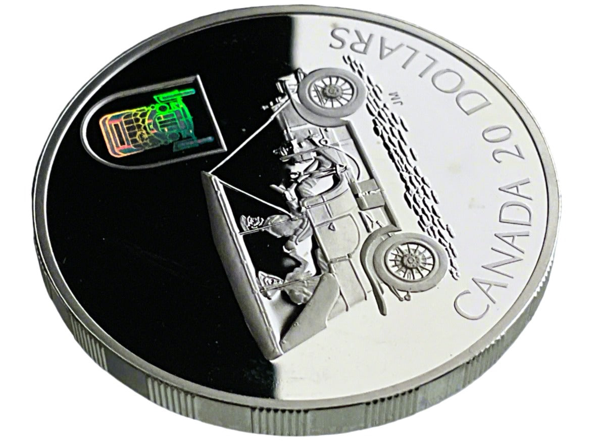 This image depicts the 2001 Canadian $20 silver hologram coin featuring "The Russell 'Light Four'" automobile.