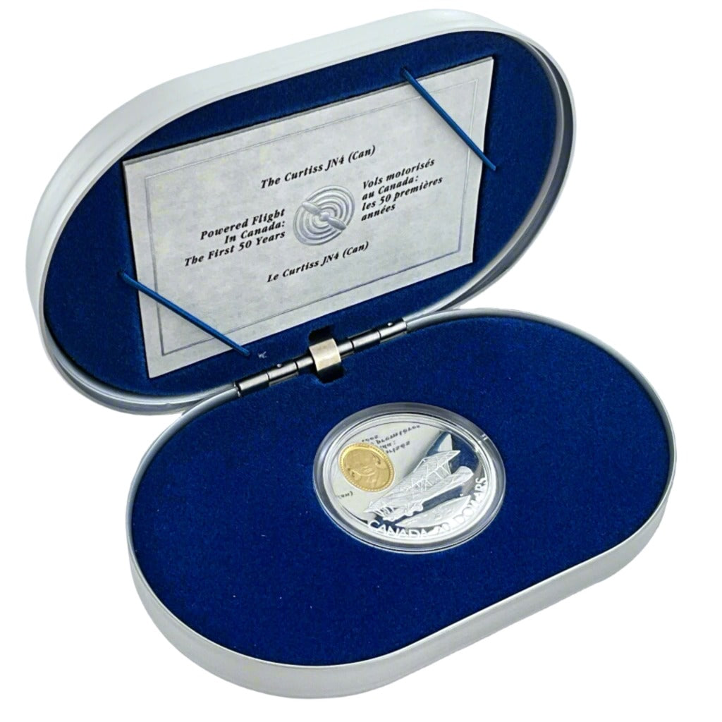 This image shows the 1992 Canadian $20 Aviation Series I: Curtiss JN-4 (Canuck) Sterling Silver Coin, which is the fifth coin in a ten-coin series commemorating the Powered Flight in Canada: The First 50 Years.