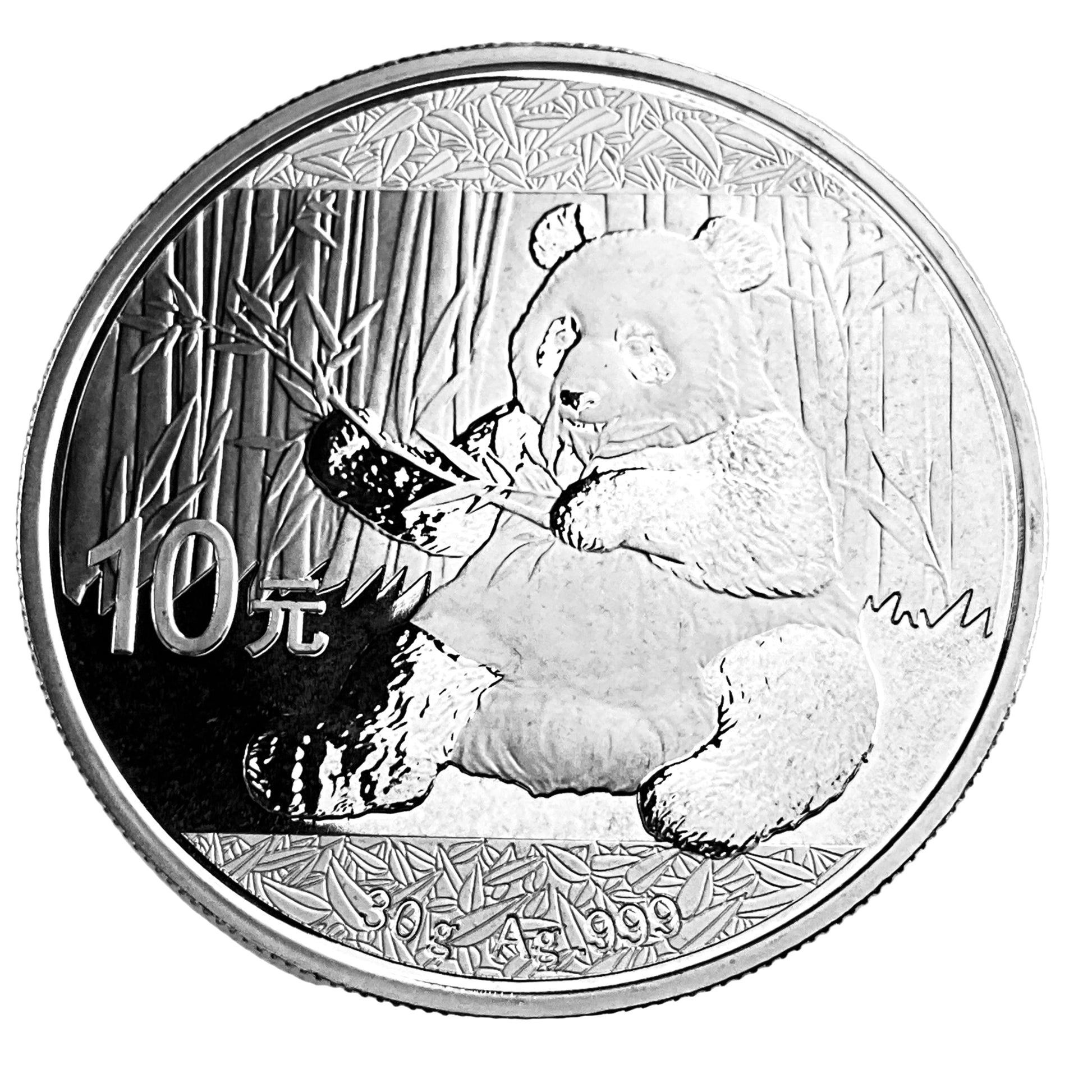 Chinese Silver Panda Coin, specifically a 30-gram version, indicated by "30g Ag .999" and "10元" (10 Yuan) on the coin.