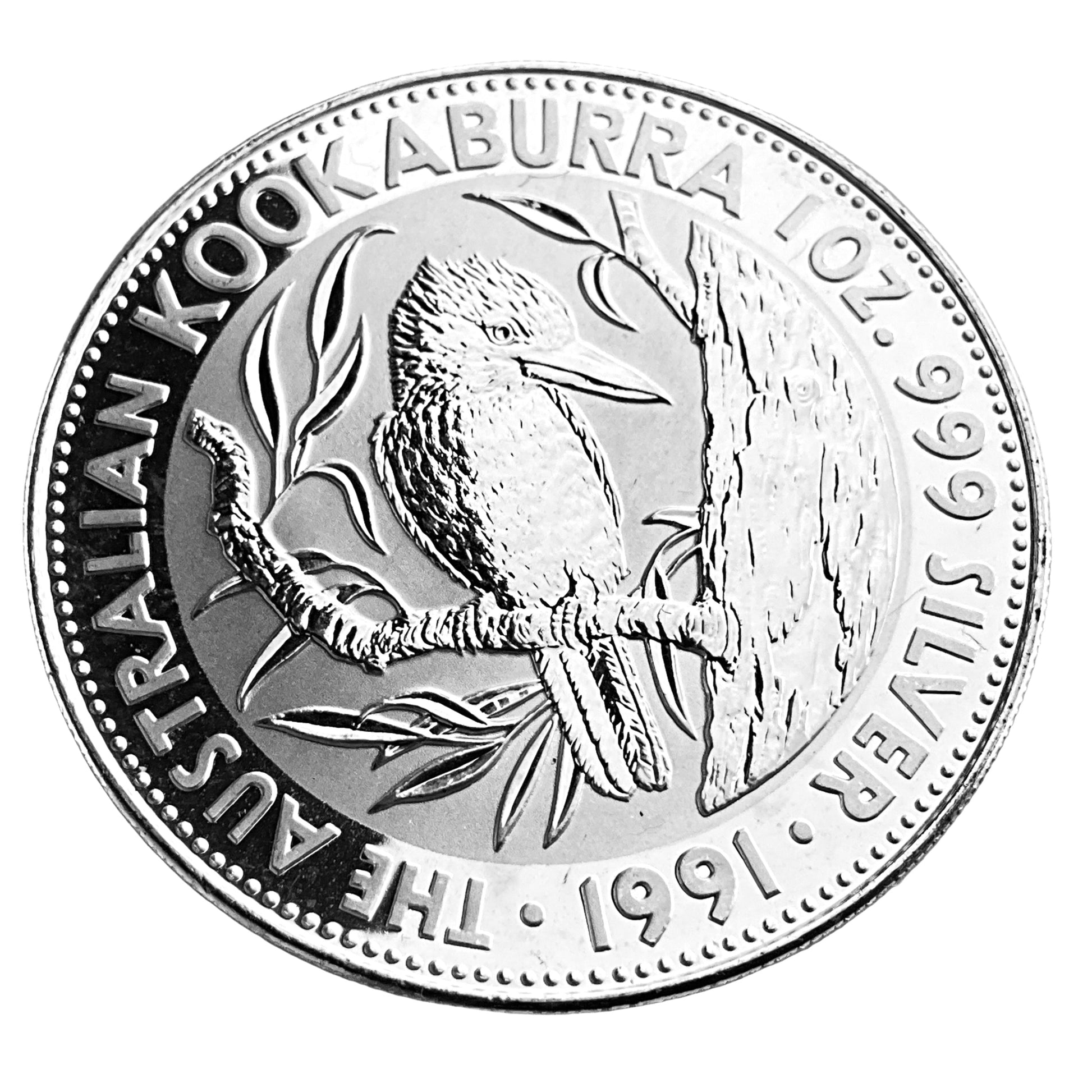 This coin features a Kookaburra perched on a tree branch, with the inscription "AUSTRALIAN KOOKABURRA 1 OZ. 999 SILVER 1991".