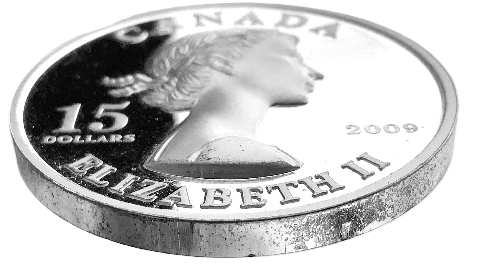 This is the 2009 Canada $15 Vignettes of Royalty Queen Elizabeth II sterling silver coin.