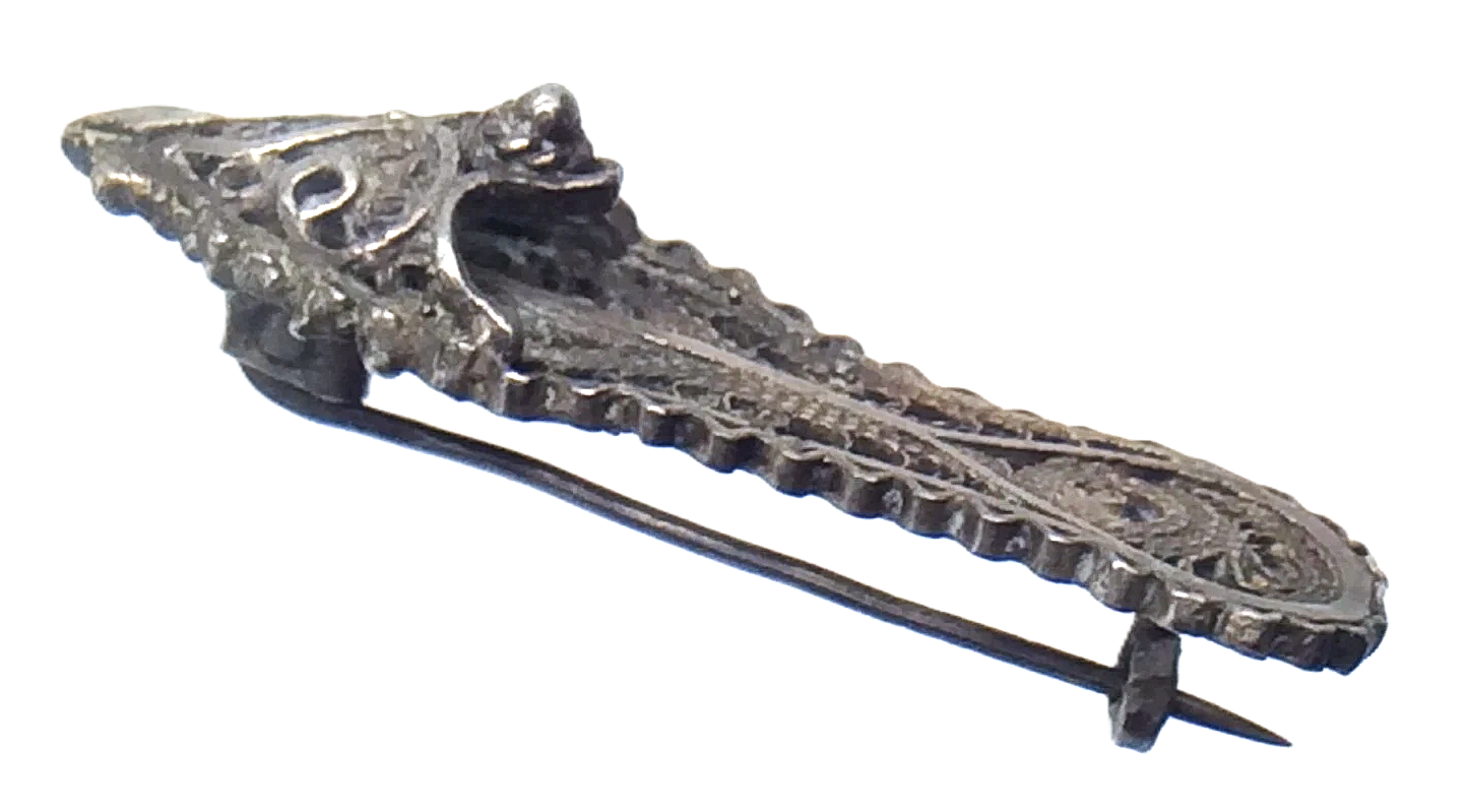 This is an antique Ottoman silver filigree slipper brooch pin.