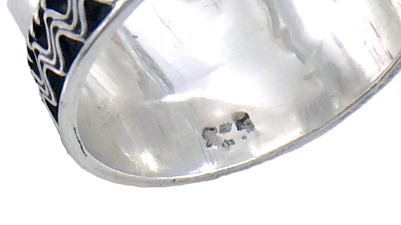This is a vintage wide sterling silver cigar band ring with a bezel-set black onyx cabochon stone.