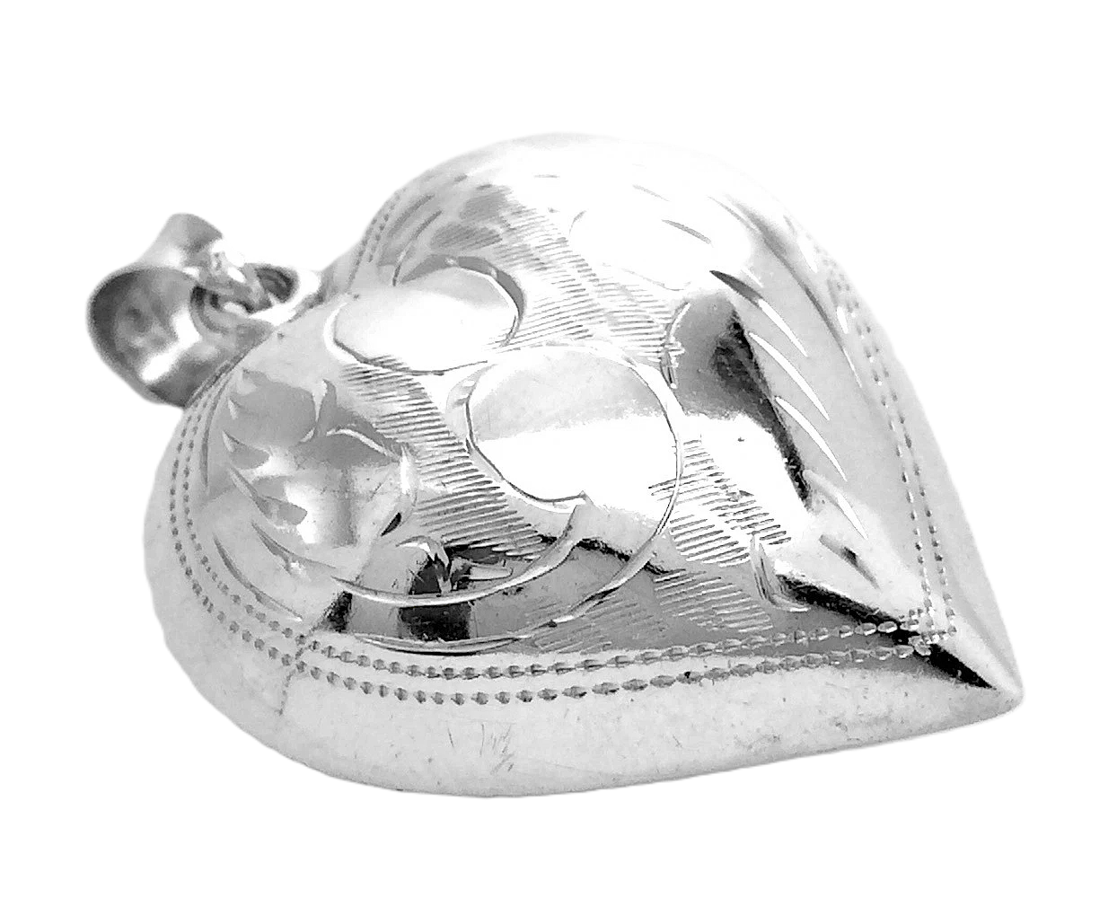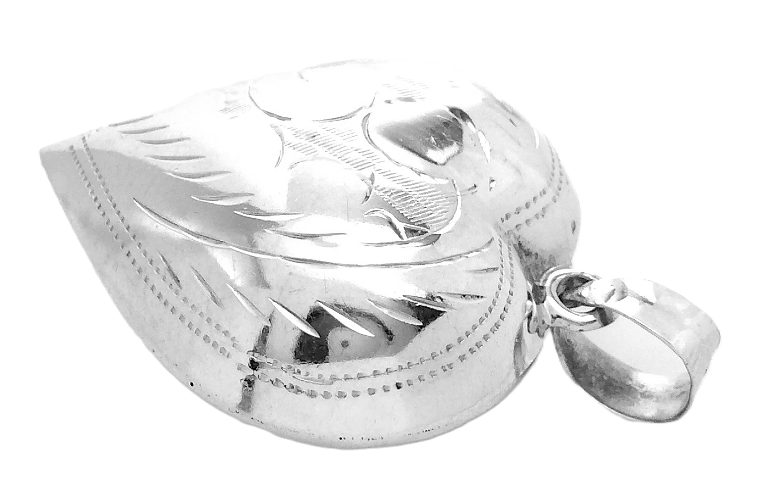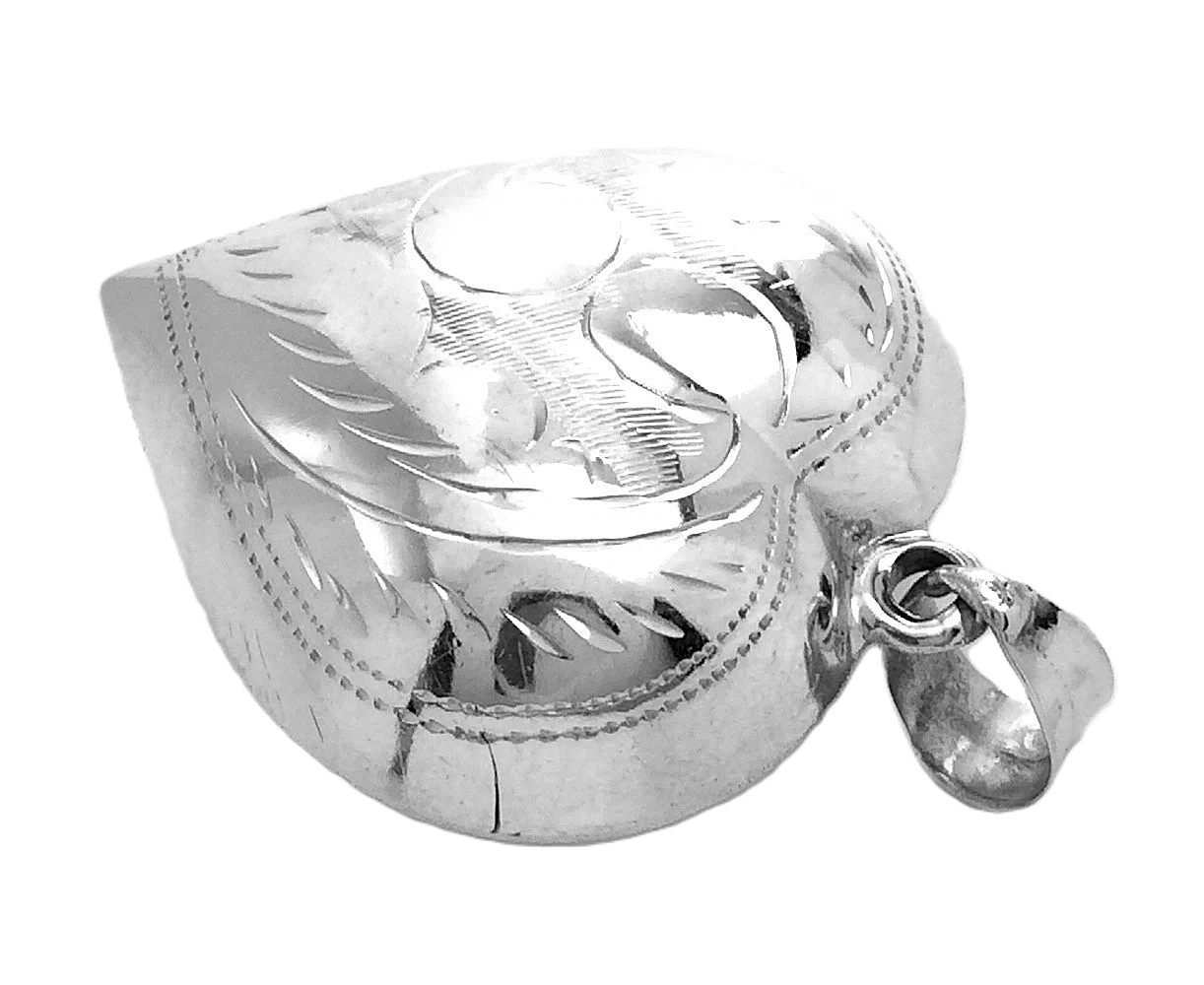 This is a vintage sterling silver etched and diamond-cut puffy heart locket pendant.
